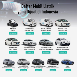 Berikut adalah beberapa model mobil listrik yang saat ini tersedia di pasar Indonesia: